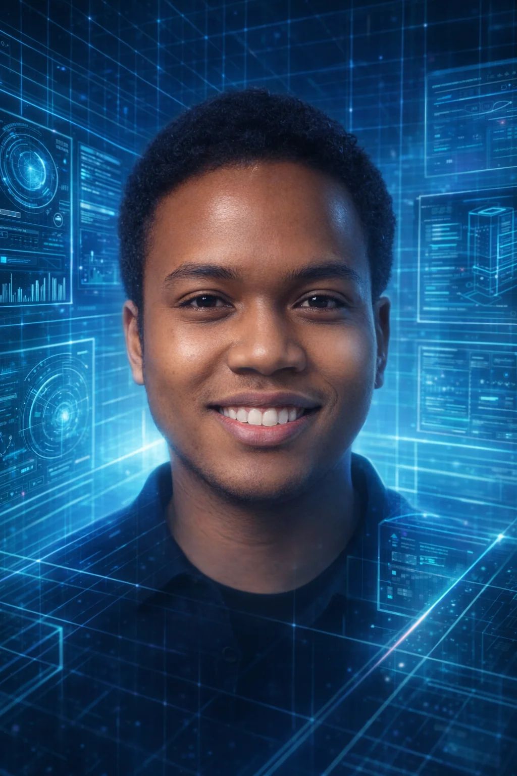The 'Holo-Grid' style is a composite of this futuristic language. The foundational "shimmering grids of light" serve as the 3D "workspace," defining the volume of the holographic display and giving it a sense of rational, mappable space. Upon this grid, the "glowing, semi-transparent UI elements" and "data readouts" are layered. Their translucency is their most important feature, allowing for immense information density where data can be stacked, moved, and seen-through. By overlaying your portrait with these elements, the style does not just place a filter on you; it places you in the role of an operator within a high-tech command centre, actively engaging with a cascade of tangible, luminous data.