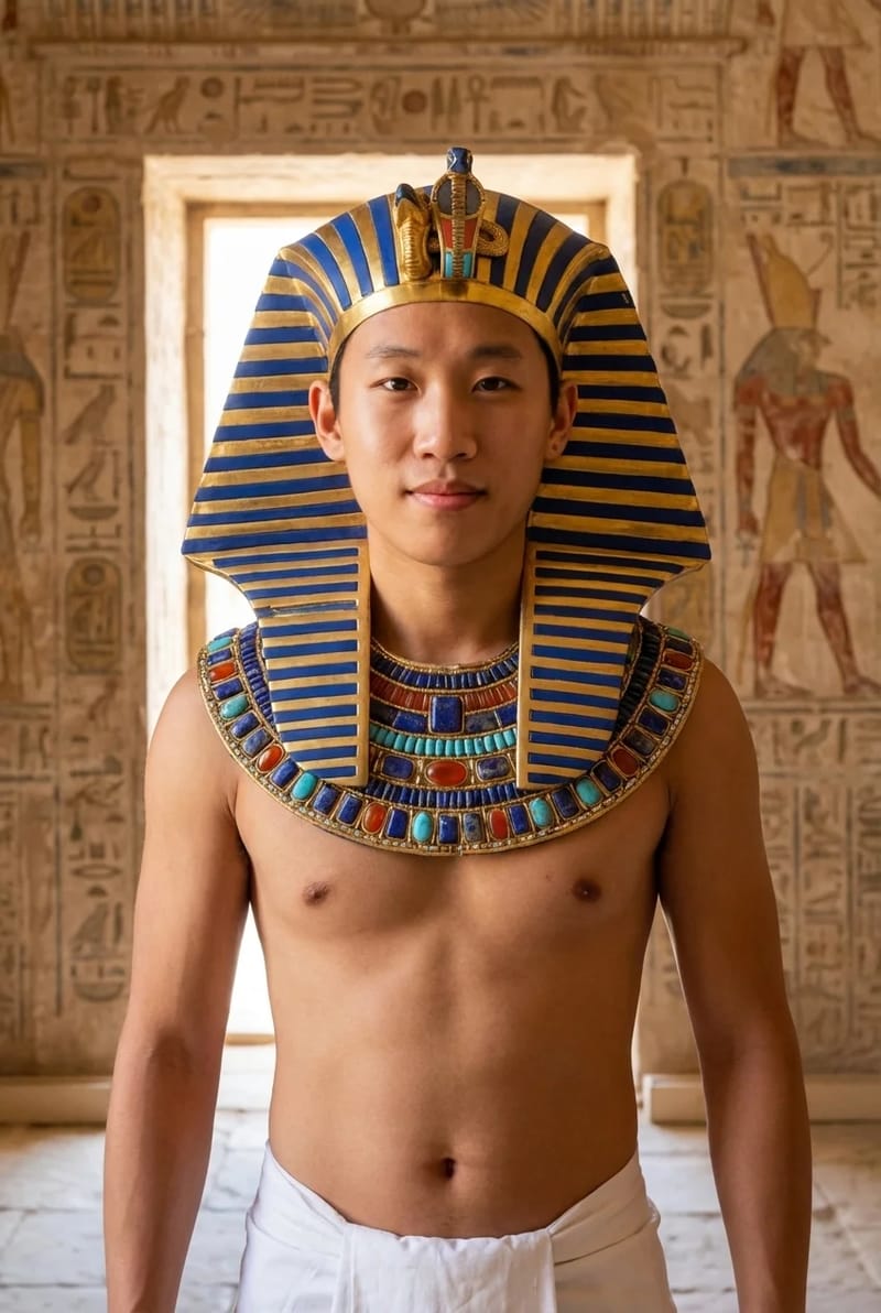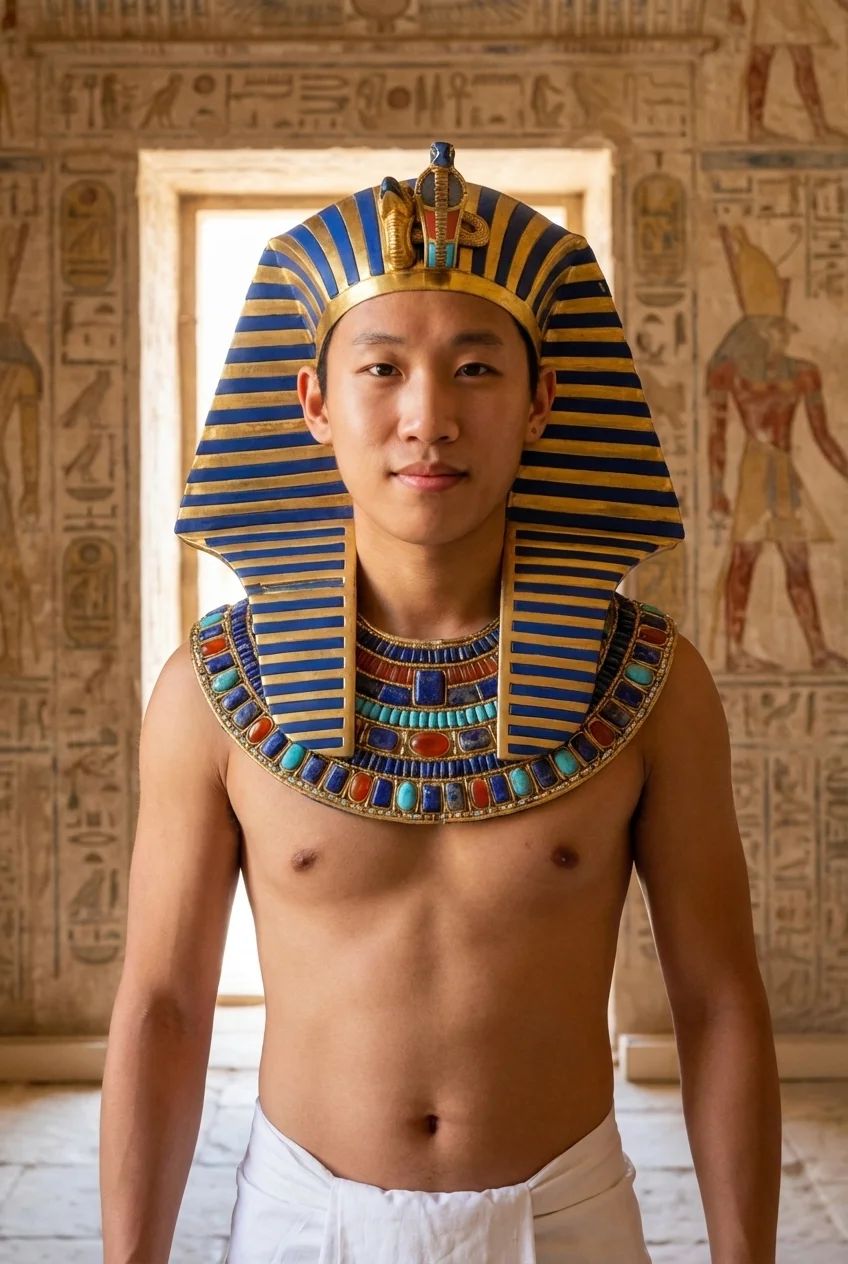 Rule as a living god. This style transforms you into the sovereign of a great Nile Dynasty, adorning you in the golden regalia and iconic headdress of an all-powerful Pharaoh.