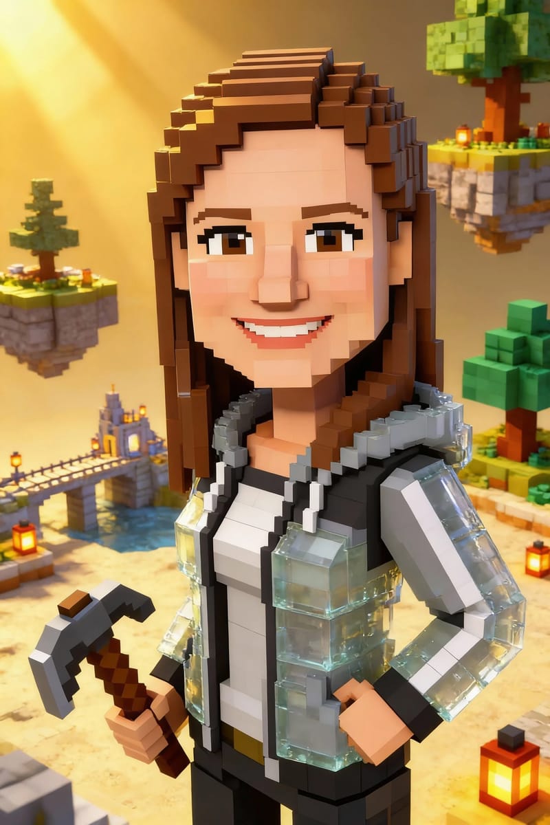 Build your new identity, block by block. A premium voxel hero render with cinematic lighting, crisp geometry, and a crafted sandbox world behind you.