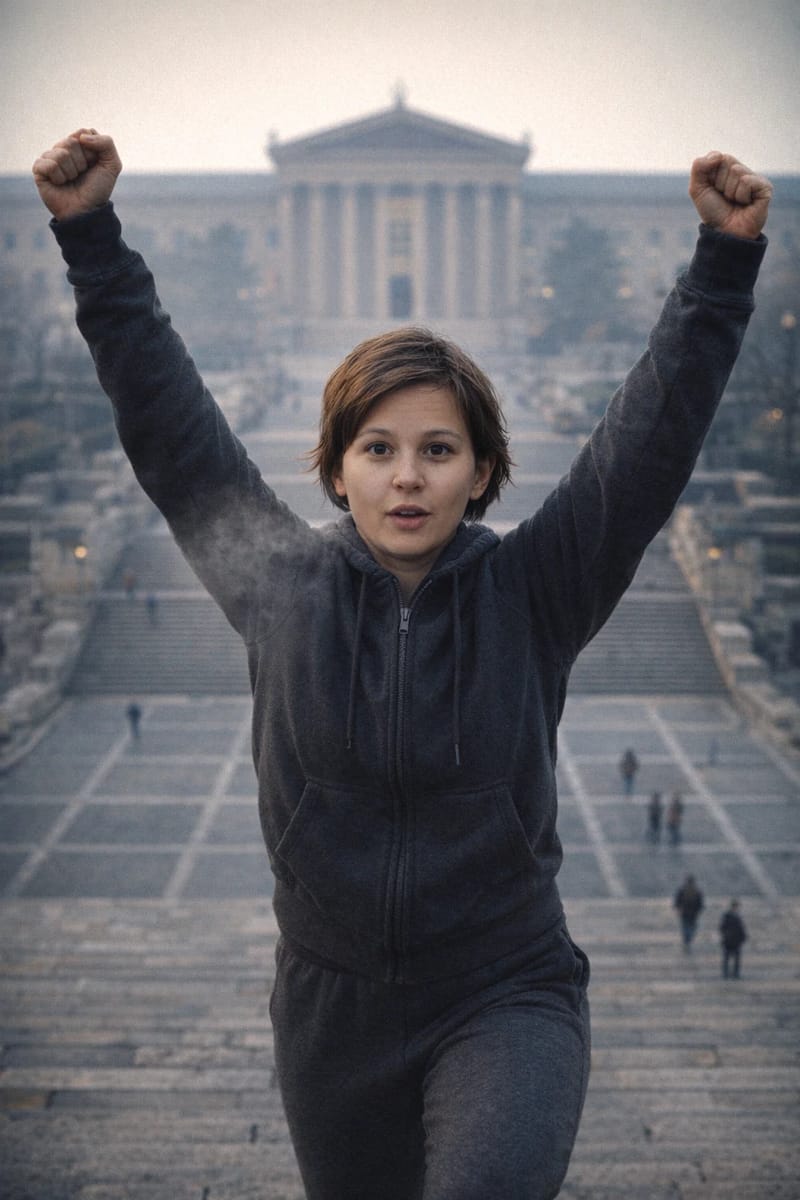 Become the underdog champion in a gritty, triumphant training-shot moment on iconic city steps.