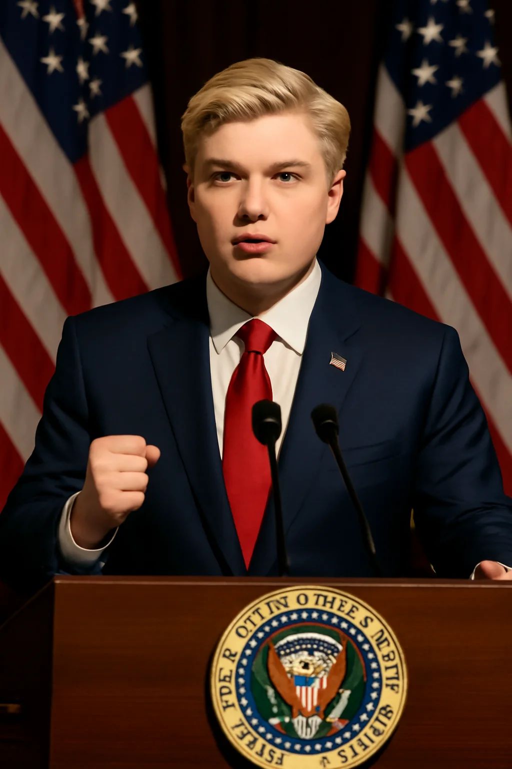 This style is inspired by the formal, institutional portraiture of executive power. Its philosophy is one of symbolic transference: the portrait's primary function is to visually merge the individual with the immense gravitas and historical continuity of the office they hold. The setting itself—the Oval Office—is the most potent symbolic environment in this composition. It is not merely a backdrop but a globally recognised stage for ultimate authority. Every element within it, from its distinct architecture to its specific furnishings, has been absorbed into a powerful, shared iconography of leadership and state power.