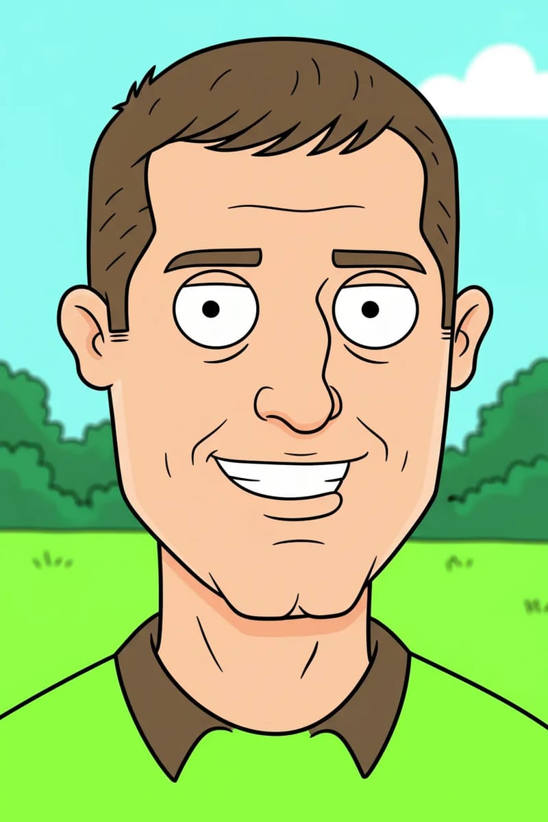 The 'Pawtucket Patriot' style achieves its iconic look through a specific set of anatomical rules. Characters are designed with a low centre of gravity, often featuring large, rounded heads and prominent jaws that sit on simplified, pear-shaped bodies. Features are minimal, designed for broad, quick expression rather than subtle emotion. This is all rendered with clean, consistent outlines and a bright, flat, cel-shaded colour palette, creating a functional, instantly recognisable, and comically absurd world that is the perfect stage for its particular brand of satire.