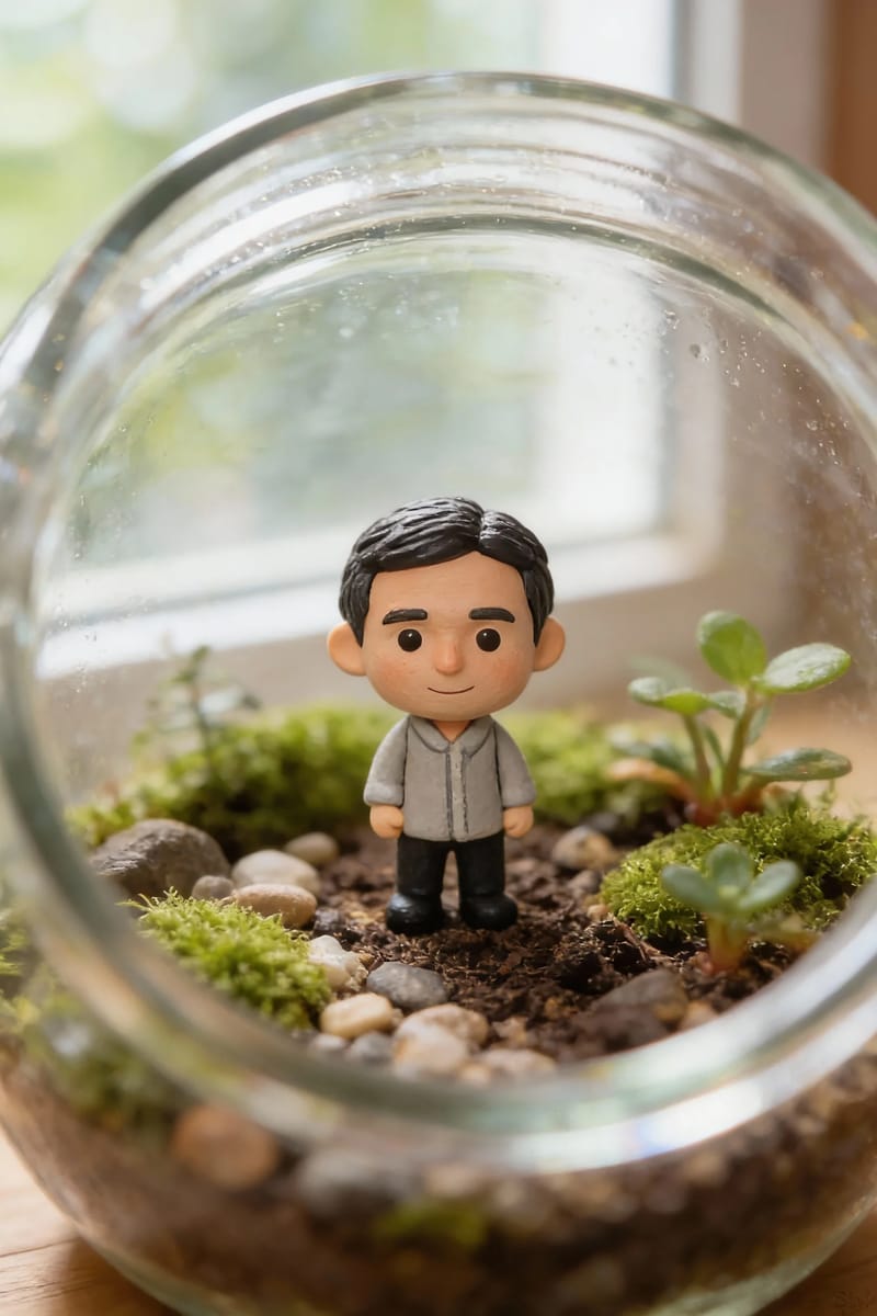 Shrink into a tiny world inside a glass terrarium jar—moss, pebbles, misty reflections, and cozy win...