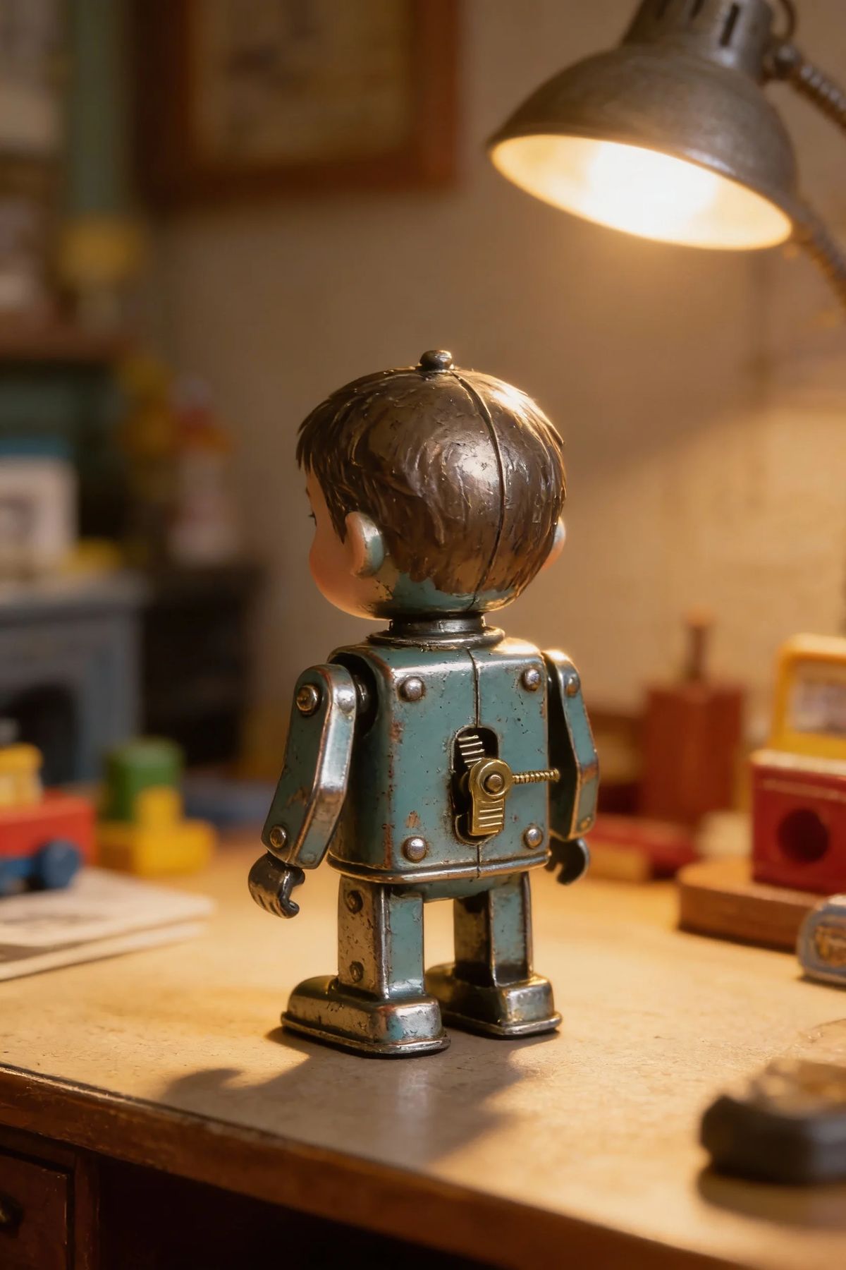Become a retro wind‑up toy: painted tin textures, charming scuffs, and a desk-top toy-photo setup wi...